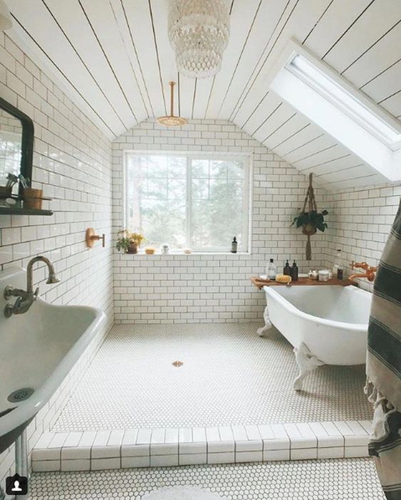 Een dakraam is altijd een aanrader op zolder, maar je zou zelfs twee dakramen kunnen nemen om meer daglicht te creëren in de badkamer. Een extra dakraam betekent natuurlijk ook een betere ventilatie en frisse lucht. Deze zolder badkamer hebben ze dat op een hele mooie en strakke manier gerealiseerd. Er is een douchecabine geplaatst met een glazen douchewand, waar de wanden betegeld zijn met mooie grijze metrotegels . En ook de zwart witte patroontegels op de vloer zien er super leuk uit, net als de vele groene plantjes in verschillende potjes en manden.
