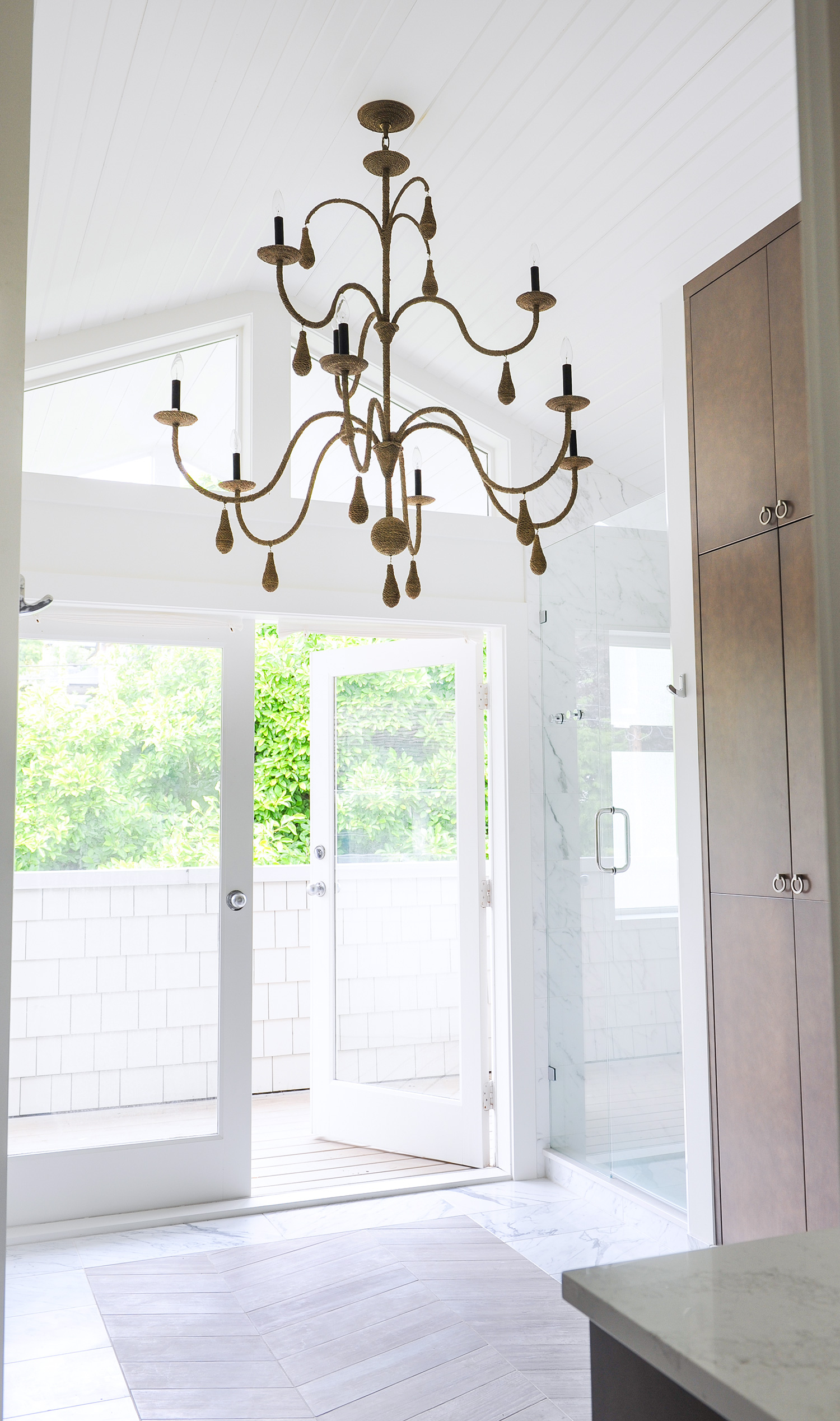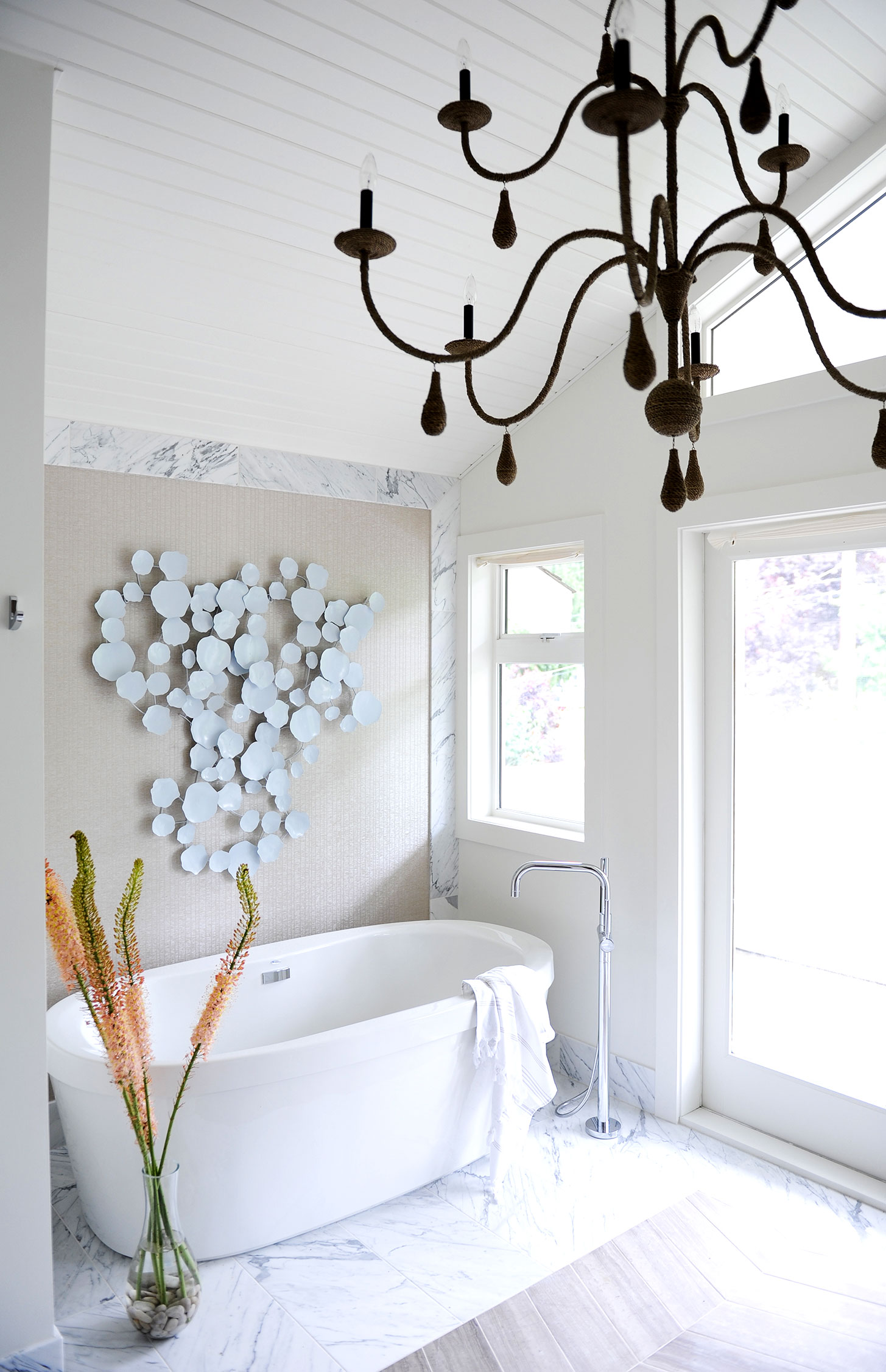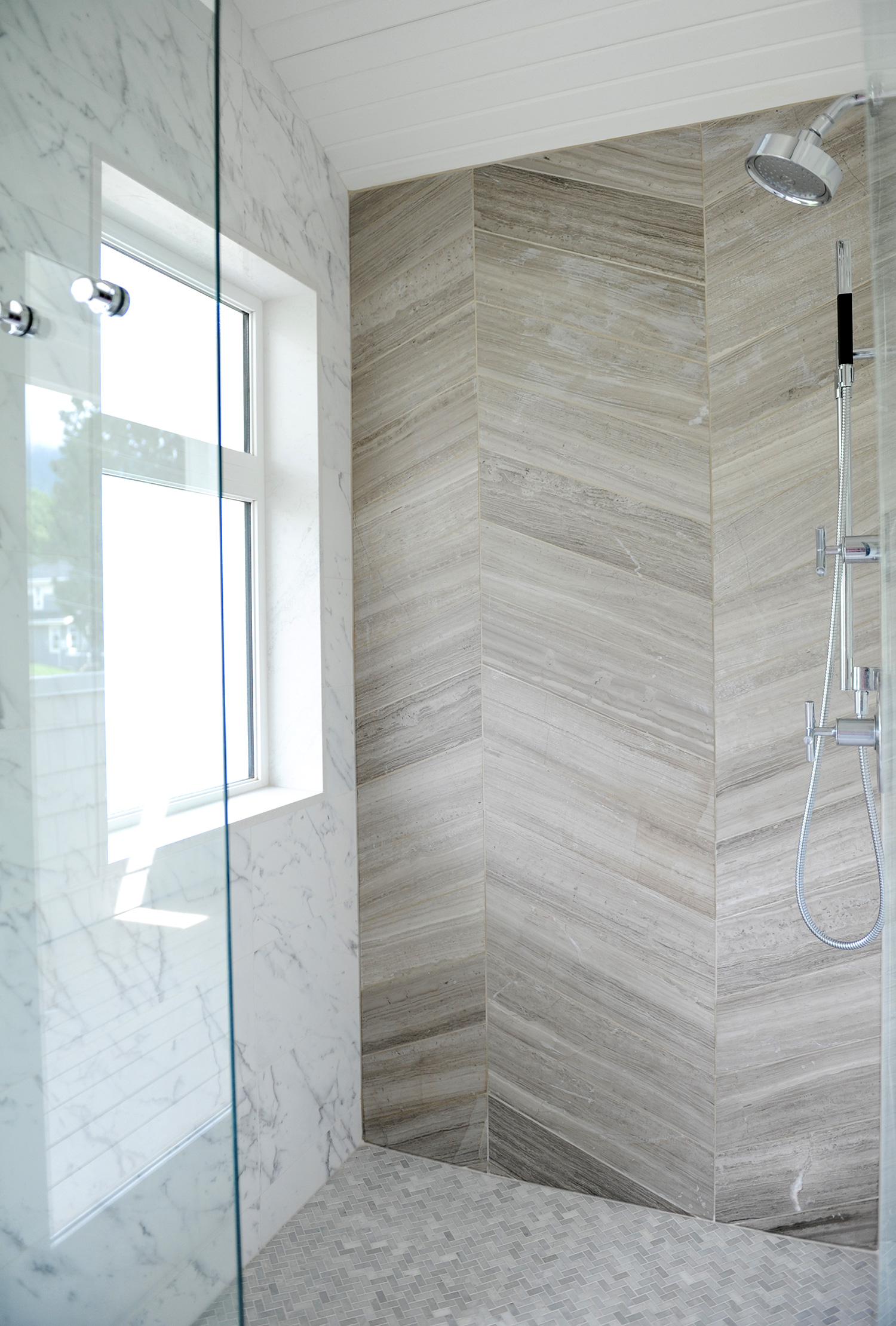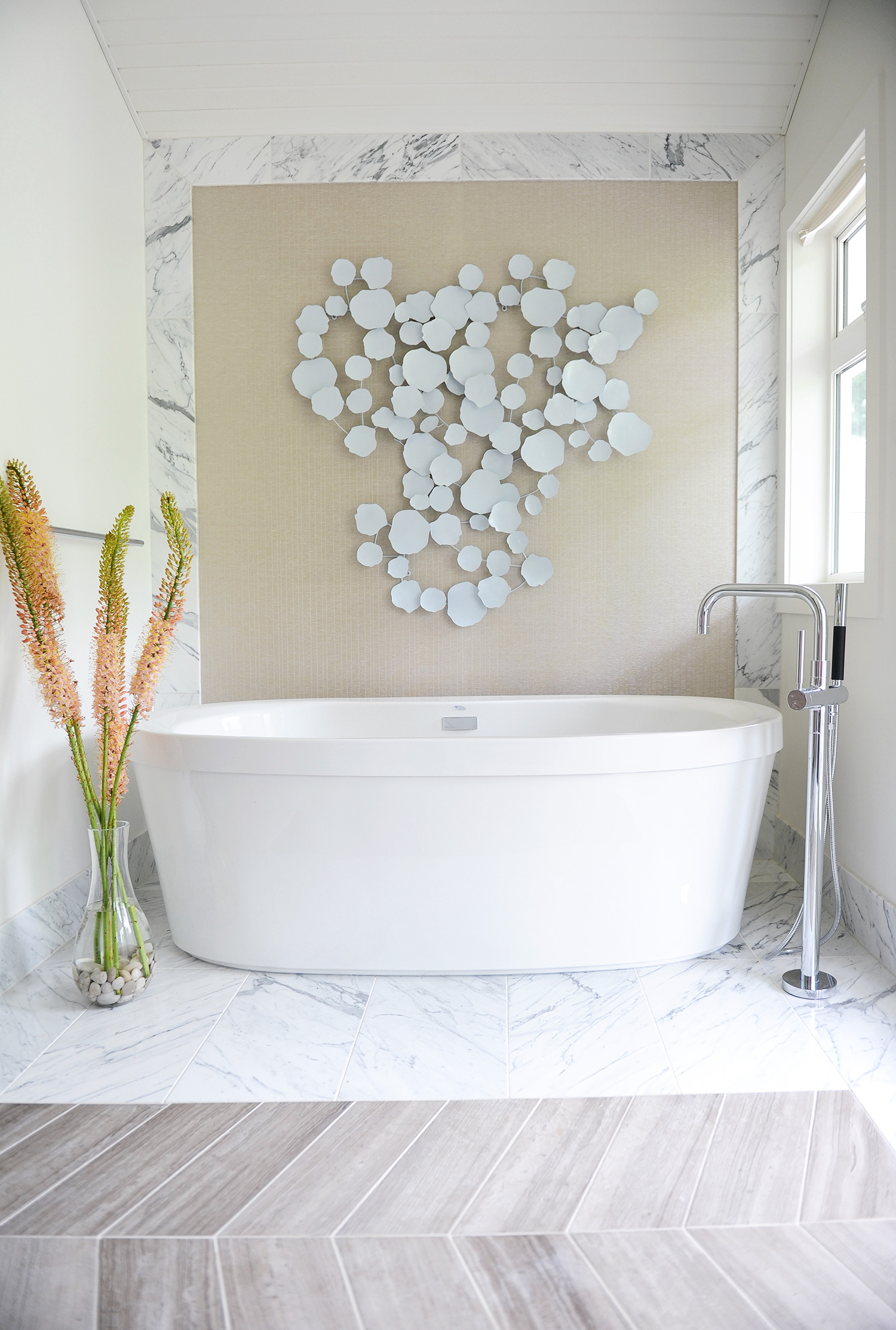 Gillian en haar team streven ernaar om een comfortabele luxe te creëren en een strandvibe op een moderne en verfijnde manier te interpreteren. Natuurlijke materialen – twee soorten marmeren vloeren, marmeren planken en framing en gebrandschilderd houtmolenwerk hebben bijgedragen aan de luxe, maar tóch strandachtige sfeer. “Hoewel ik marmer prachtig vind, moet toegeven dat ik soms moe ben om badkamers te zien die allemaal wit marmer zijn”, aldus Gillian. “Het is mooi, maar we wilden iets uniek maken. Toen we dit houtachtige Athena-grismarmer vonden, wisten we dat we het perfecte contrastmateriaal hadden gevonden. We hebben besloten om het effect van een gebiedskleed te creëren met een chevron haringbeen ’tapijt’ ingebouwd in de ruimte. Met geborstelde textuur op het marmer en veel grout, verdubbelt het ook als een anti-slipzone tussen de badkuip en de douche. ”
