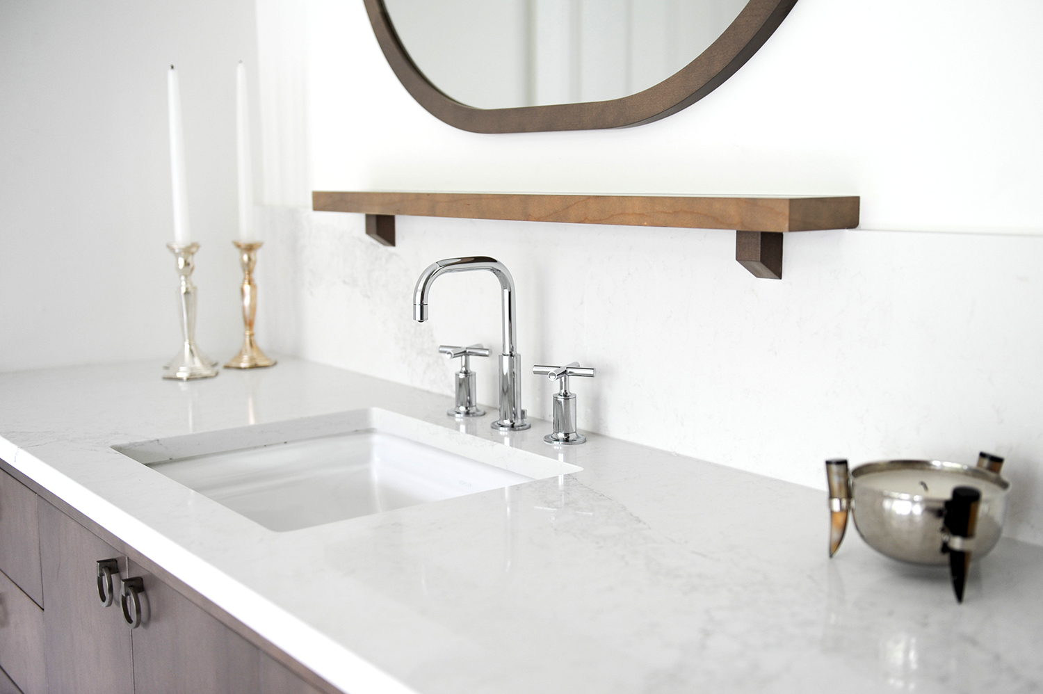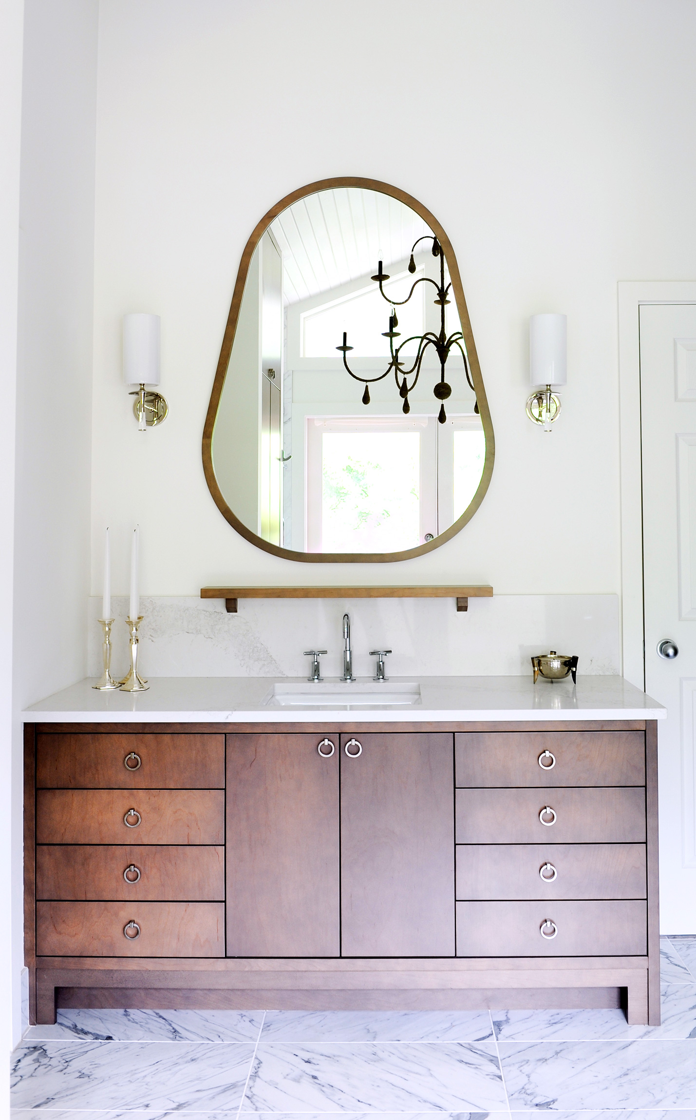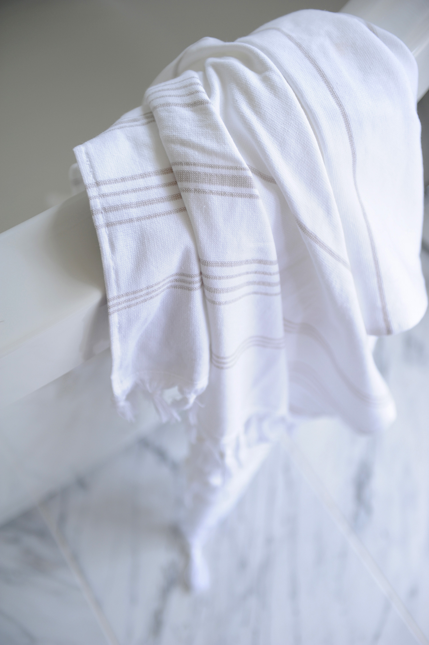 Gillian en haar team streven ernaar om een comfortabele luxe te creëren en een strandvibe op een moderne en verfijnde manier te interpreteren. Natuurlijke materialen – twee soorten marmeren vloeren, marmeren planken en framing en gebrandschilderd houtmolenwerk hebben bijgedragen aan de luxe, maar tóch strandachtige sfeer. “Hoewel ik marmer prachtig vind, moet toegeven dat ik soms moe ben om badkamers te zien die allemaal wit marmer zijn”, aldus Gillian. “Het is mooi, maar we wilden iets uniek maken. Toen we dit houtachtige Athena-grismarmer vonden, wisten we dat we het perfecte contrastmateriaal hadden gevonden. We hebben besloten om het effect van een gebiedskleed te creëren met een chevron haringbeen ’tapijt’ ingebouwd in de ruimte. Met geborstelde textuur op het marmer en veel grout, verdubbelt het ook als een anti-slipzone tussen de badkuip en de douche. ”
