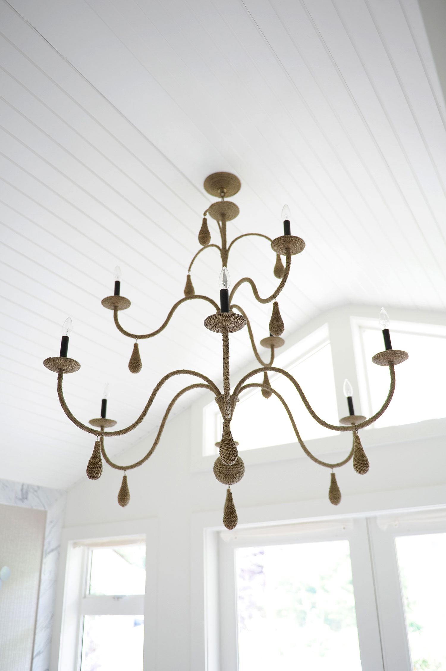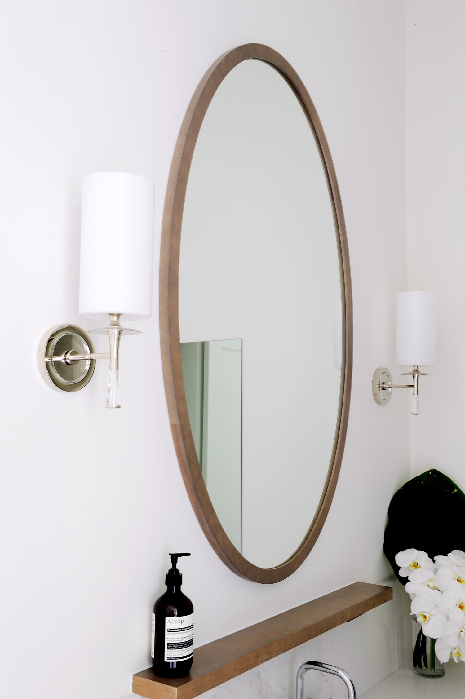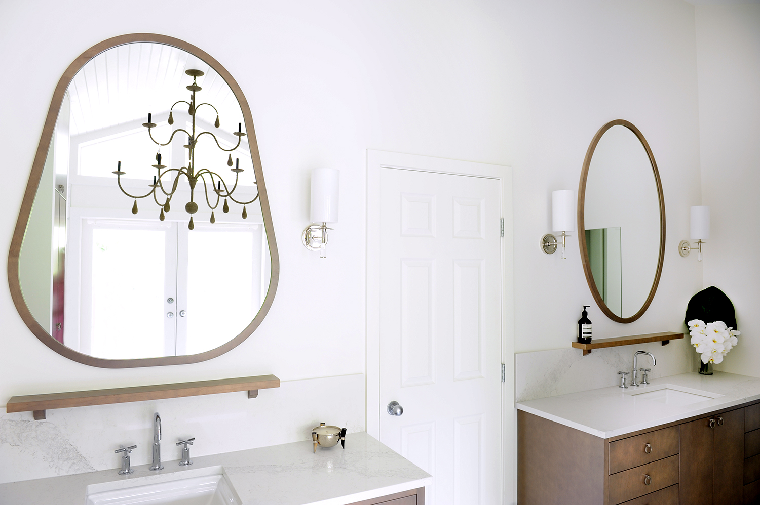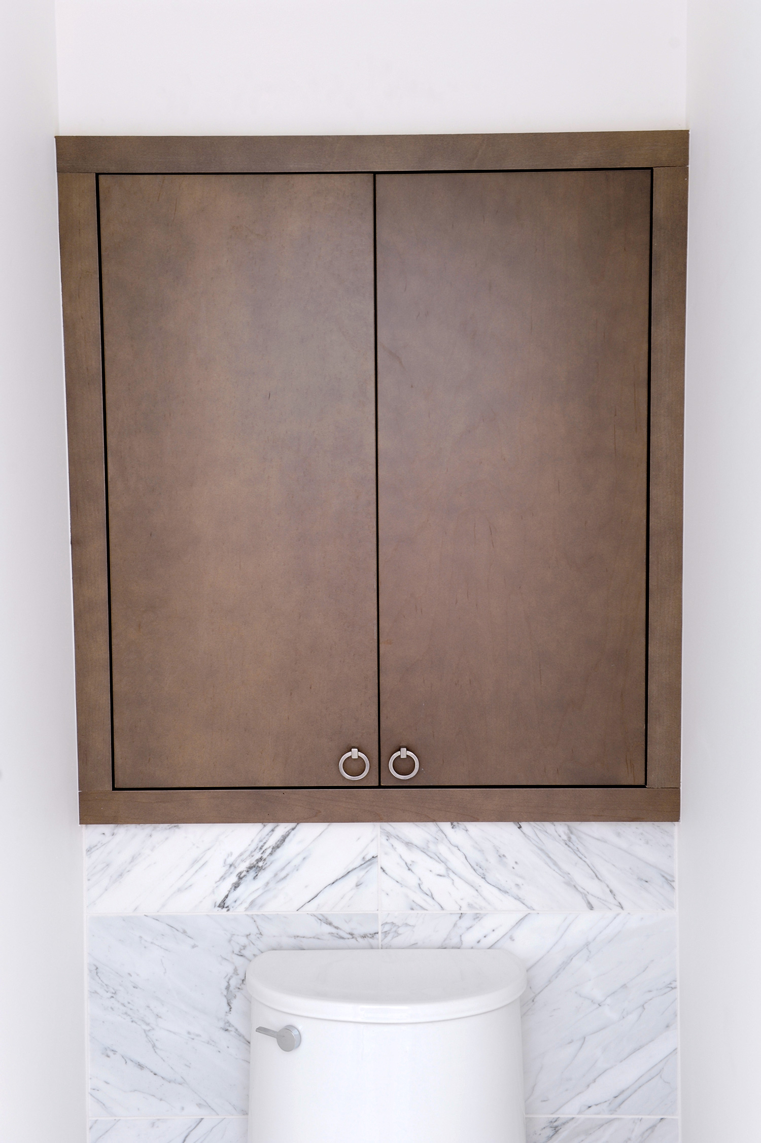 Gillian en haar team streven ernaar om een comfortabele luxe te creëren en een strandvibe op een moderne en verfijnde manier te interpreteren. Natuurlijke materialen – twee soorten marmeren vloeren, marmeren planken en framing en gebrandschilderd houtmolenwerk hebben bijgedragen aan de luxe, maar tóch strandachtige sfeer. “Hoewel ik marmer prachtig vind, moet toegeven dat ik soms moe ben om badkamers te zien die allemaal wit marmer zijn”, aldus Gillian. “Het is mooi, maar we wilden iets uniek maken. Toen we dit houtachtige Athena-grismarmer vonden, wisten we dat we het perfecte contrastmateriaal hadden gevonden. We hebben besloten om het effect van een gebiedskleed te creëren met een chevron haringbeen ’tapijt’ ingebouwd in de ruimte. Met geborstelde textuur op het marmer en veel grout, verdubbelt het ook als een anti-slipzone tussen de badkuip en de douche. ”